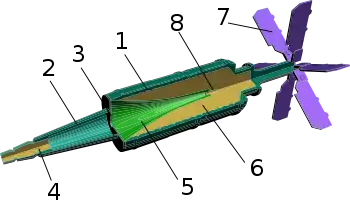 Под номерами: 1 — корпус, 2 — обтекатель, 3 — защита кумулятивной воронки, 4 — аппаратура взрывателя, 5 — кумулятивная воронка, 6 — взрывчатое вещество, 7 — стабилизаторы, 8 — инициирующий заряд
