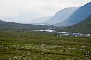- Синги — Квиккйокк:[2] Тропа пересекает несколько горных озёр. Перед Ваккотаваре открываются виды на юг, на вершины парка Сарек. Между Ваккотаваре и Салтолуоктой тропу прерывает водохранилище Аккаяуре, появившееся в результате строительства ГЭС на реке Стура-Лулеэльвен; через него есть паромная переправа. От Салтолуокты на юг тропа тянется по пустошам и болотам с редкими берёзками и ивами, на восток уходят равнинные земли, на западе поднимаются предгорья Сарека. Из хижин Ситояуре и Акце многие туристы отправляются в парк Сарек и его главную достопримечательность - долину Рападален. Тропа пересекает горные озёра и леса.