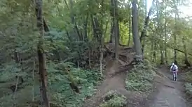 ![]() Нижняя терраса мыса, образованного сходящимися оврагами, на котором располагается Кунцевское городище. Вид со стороны Москвы-реки | |