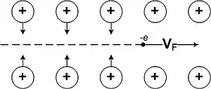 Для простоты рассмотрим простую кубическую кристаллическую решётку с периодом состоящую из положительно заряженных одновалентных ионов с массой и электрон, двигающийся со скоростью Ферми вдоль какой-либо оси симметрии (рис. 1). Более того, будем рассматривать взаимодействие при Когда электрон пролетает между ближайшими к нему ионами, те, в свою очередь, приобретают импульс в направлении, перпендикулярном движению электрона: