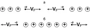 Под действием этого импульса ионы смещаются так, как показано на рис. 1. При этом кинетическая энергия, которую приобретает ион за время взаимодействия, переходит в потенциальную. Таким образом, за движущимся электроном следует область избыточного положительного заряда, который создаёт отрицательный (притягивающий) потенциал для другого электрона (рис. 2а). Когда в образовавшуюся потенциальную яму попадает другой электрон, то его потенциальная энергия понижается и между парой электронов возникают силы притяжения. При этом притяжение возникает только тогда, когда электроны движутся в разные стороны (рис. 2б). Кроме того, для образования куперовской пары спины электронов должны быть противоположными (антипараллельными).