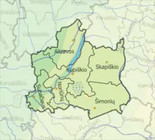 - 7 местечек — Ализава, Анташава, Палевине, Саламестис, Скапишкис, Сенасис-Субачюс и Шимонис;