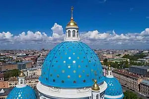 Церковь с несколькими куполами-луковицами является типичной формой русской церковной архитектуры, которая отличает её от архитектуры других православных народов и христианских конфессий. Исторически первыми примерами подобных русских церквей являются деревянный предшественник Софийского собора в Новгороде с 13-ю куполами (989)[5] и первый храм на месте каменной Десятинной церкви с 25-ю куполами в Киеве (989—996). Количество куполов обычно имеет символическое значение в русской архитектуре, например, 13 куполов символизируют Христа с 12 апостолами, а 25 куполов — ещё и с 12 пророками Ветхого Завета. В сравнении с византийскими (парусными) куполами, купола русских церквей обычно меньшего размера и часто покрываются позолотой или ярко окрашиваются.