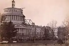 Уолтер сделал эскиз этого проекта размером в семь футов (2,1 м) и показал его в своем кабинете, где тот привлек живое внимание членов Конгресса в 1854 году[12]. Год спустя, 3 марта 1855 года, президент Франклин Пирс подписал соглашение об ассигнованиях в размере 100 000 долларов США (эквивалентно 2,19 млн долларов в 2018 году) для постройки купола[13]. После некоторых практических изменений в первоначальном проекте (таких как сокращение колонн с 40 до 36) строительство началось в сентябре того же года с удалением купола, возведённого Чарльзом Булфинчем. Внутри ротонды были построены уникальные леса, призванные распределять вес в стороны от слабой центральной части пола, и был установлен кран с паровым двигателем (работающим на древесине из старого купола)[14].