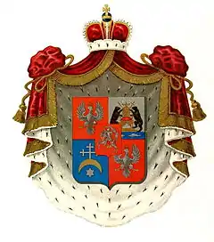 Описание герба: Описание Общего гербовника Щит, разделённый на четыре части, имеет в середине малый щиток, в котором изображён Литовский герб, а именно: в красном поле скачущий на белом коне воин с поднятым вверх мечом. В правой верхней и в левой нижней частях в красном поле изображён польский герб — белый одноглавый орёл. В левой верхней части в серебряном поле изображён новгородский герб — малинового цвета стул, на котором изображены крестообразно державный жезл и длинный крест; над стулом тройной подсвечник с горящими свечами, по сторонам стула два чёрных медведя, стоящие на задних лапах. В правой нижней части в голубом поле видны — серебряный крест, шестиугольная звезда, а между ними золотой полумесяц, обращённый рогами вниз. Щит покрыт мантией и шапкой, принадлежащих княжескому достоинству.[1] |