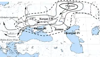 Курганная гипотеза прародины протоиндоевропейцев подразумевает постепенное распространение «курганной культуры», охватившей в конце концов все причерноморские степи. Последующая экспансия за пределы степной зоны привела к появлению смешанных культур, таких, как Культура шаровидных амфор на западе, кочевых индо-иранских культур на востоке и переселению протогреков на Балканы примерно в 2500 году до н. э.