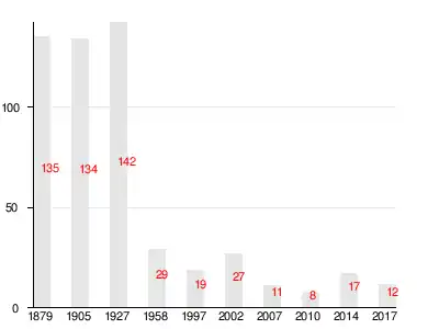| 1879 | 1905 | 1927[14] | 1958[15] | 1997 | 2007[16] | 2010[17] |