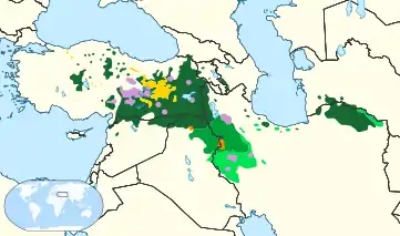 ![]() Распространение курдского языка на территориях Западной Азии Регионы, где он является языком большинства Регионы, где он является языком меньшинства | |