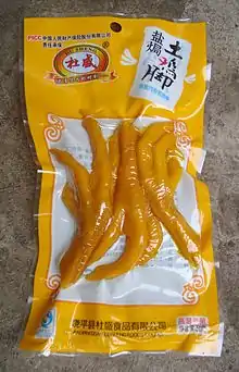 Помимо куриных лапок в Китае пользуются спросом лапки уток[5]. Утиные ноги едят с горчицей, уксусом, свежим зелёным перцем и толчёным чесноком. Это одна из популярных китайских закусок.