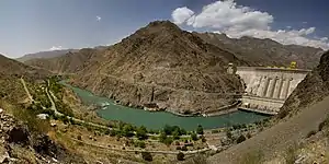 - гравитационную бетонную плотину треугольного профиля, максимальной высотой 113 м, длиной по гребню — 360 м. Плотина оборудована глубинным водосбросом в виде трубы 5×7 м, расположенной в основании плотины и оборудованной сегментным затвором в выходной части, пропускной способностью 1037 м³/с при НПУ. Также на плотине в её центральной части размещены водоприёмники турбинных водоводов, а также сами сталежелезобетонные турбинные водоводы, находящиеся на низовой грани плотины;