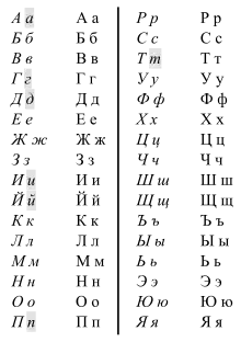- в типографике — печатный шрифт с наклоном основных штрихов приблизительно в 15° и скруглёнными формами штрихов и их соединений, несколько напоминающий рукописный; используется большей частью как вид выделительного начертания для письменностей, в которых основные штрихи ориентированы преимущественно вертикально.[1]