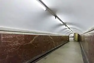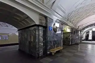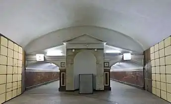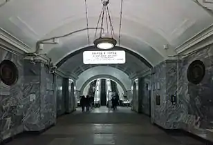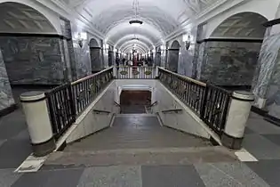 Станция имеет один подземный вестибюль (общий со станцией Кольцевой линии), в который можно выйти из восточного торца. Центральный зал соединяется с промежуточным вестибюлем тремя эскалаторами типа ЭТ-3М, установленными в 2000 году[7] с балюстрадами из нержавеющей стали. Промежуточный вестибюль — большое кубическое помещение, из которого в одну сторону широкий проход выводит в круглый колонный вестибюль. В центре него стоит мощная, круглая, развивающаяся вверх колонна (столп). Основание этой колонны как бы заглублено в пол, а углубление обведено по кругу небольшим гранитным бортиком[8]. Поверхность столпа покрыта затейливой лепниной растительных мотивов. На ней также размещены небольшие лепные медальоны с сельскими сценками[8]. Потолок зала опирается на столп, а также на два кольца колонн. Эти колонны — круглые, каннелированные, облицованные сургучно-красным мрамором, и квадратные, облицованные светло-кремовым мрамором. Стены зала облицованы розовым и желтоватым мрамором Газганского месторождения[8].