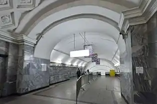 Конструкция станции — пилонная трёхсводчатая глубокого заложения[1]. Сооружена по типовому проекту (архитектор Л. М. Поляков). Диаметр центрального зала 9,5 метров, боковых залов — 8,5 метров.