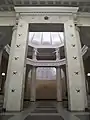 В центре этого подземного зала стоит мощная, круглая, развивающаяся вверх колонна (столп). Основание этой колонны как бы заглублено в пол, а углубление обведено по кругу небольшим гранитным бортиком[7]. Поверхность столпа покрыта затейливой лепниной растительных мотивов. На ней также размещены небольшие лепные медальоны с сельскими сценками[7]. Потолок зала опирается на столп, а также на два кольца колонн. Эти колонны — круглые, каннелированные, облицованные сургучно-красным мрамором, и квадратные, облицованные светло-кремовым мрамором. Стены зала облицованы розовым и желтоватым мрамором Газганского месторождения[7].