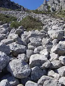 - Локальные, ограниченные в трёхмерном пространстве скопления каменных остроугольных глыб, образовавшиеся естественным путём, имеющие вид сомкнутого нерасчленённого покрова на дневной поверхности земли;