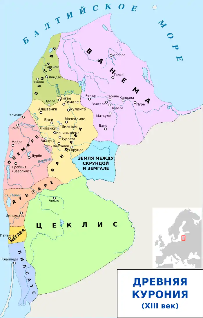 - Ванема, или Мирная Курса terra de Wanneman sive Vredecuronia (ныне Дундагский, Энгурский, Мерсрагский, Ройский края, западная часть Талсинского и Вентспилсского края, северная частьТукумского края в Латвии); в районах вдоль побережья Рижского залива и Ирбенского пролива проживали ливы, курши жили главным образом во внутренних областях вблизи городищ