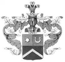 Щит разделен горизонтально на две части, из них в верхней части, в правом поле, изображена серебряная шестиугольная звезда, а в левом голубом поле — серебряная же подкова, шипами обращенная вверх. В нижней части, в чёрном поле, поставлено золотое стропило.
