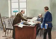 - Встреча Н. Н. Кутлера с В. И. Лениным. 1918 г. Художник И. А. Владимиров. Масло. Холст