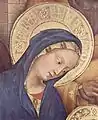 Богоматерь. Якопо Беллини, 1440 год. Её воротник украшен псевдокуфикой, а нимб — латинскими надписями. Лувр