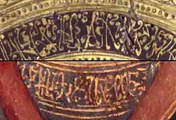 | Образцы псевдоарабской символики, на левой картине изображены фрагменты картины «Алтарь Барбадори» итальянского художника Филиппо Липпи, 1438 год. На второй картинке сверху изображены фрагменты нимба портрета Людовика Тулузского венецианского художника Якопо Беллини, 1450 год. На картинке снизу изображён нимб Богоматери венецианского художника Якопо Беллини, 1440 год. | |