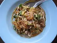 - Kyay oh — вермишелевая лапша в супе со свиными субпродуктами и зеленью.