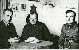![]() Президент Комитета украинцев Канады Василь Кушнир (в центре) в лагере интернированных дивизии СС «Галичина» в Римини с майором Савелием Яськевичем (справа) и подполковником Романом Долинским (слева). 1946 | |