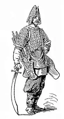 - Илл. 98. Русское вооружение с XIV до второй половины XVII столетия. Ратник в куяке и шапке медяной // Историческое описание одежды и вооружения российских войск, с рисунками, составленное по высочайшему повелению : в 30 т., в 60 кн. / Под ред. А. В. Висковатова. — Т. 1.