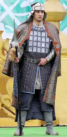 - Куяк с рукавы; у него ж 5 щитов с пугвицы с ременными; на плечах две дощечки долгие, на вертлушках; прикрыт отласом цветным. Цена 10 рублей. Прислал к Государю дани Тунгузские земли Лаба Даинмень-Герланзу в 1638 году.
