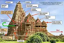 К особенностям храмов Кхаджурахо относят компактность, вытянутость вверх, отсутствие стен вокруг храмов, высокие платформы-террасы (джагати), открытые галереи вокруг храма, а также богатая скульптура. Все храмы построены по одинаковому плану. Они включают вход-портик или входной павильон (ардха-мандапа[9]), открытую галерею-вестибюль (мандапа[10]), центральный зал храма (маха-мандапа) и святилище (санктум)[4].