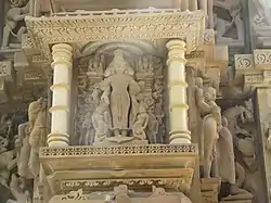 - Скульптуры божества, которому посвящён храм. Встречаются в нишах на стенах, а также в больших и средних барельефах на фасадах храмов и во внутреннем убранстве. Скульптуры в нишах выполнены в соответствии с религиозными канонами, заложенными в Агамах. Божества можно отличить по особым признакам: короне, атрибутам в руках, украшениям (каустубха), ожерельям или гирляндам (ванамала) и браслетам, ездовому животному.
