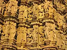 Кхаджурахо стал символом эротической скульптуры. Изящные женщины (сурасундари) и их спутники представлены в жизненных сценах. Сурасундари может раздеваться, зевать, почёсывать бок, трогать грудь, умываться, вытаскивать занозу из ноги, ласкать ребёнка, играть с домашним питомцем, писать письмо, играть на флейте. Женщины танцуют и поют, держат цветы лотоса, зеркало, сосуд с водой, благовония и другое. Эротические сцены встречается на фризах платформ, а также в больших, средних и малых барельефах на фасадах храмов. Часто любовные пары помещены в местах соединений между отдельными архитектурными элементами храмов на фасаде здания (например, соединение святилища с центральным залом). Эротические скульптуры и барельефы дают представление о сексуальной жизни в Древней Индии. Из трёх целей секса в индуистской философии (продолжении рода, удовольствие и просвещение) в эротических сценах представлено только удовольствие. Все эротические сцены расположены на внешних стенах за пределами храма и нет ни одной из них внутри храмов. По мнению некоторых индологов, эротические сценки иллюстрируют тантрические практики[12]. Камасутра упоминает ряд гомосексуальных позиций в главе 8 третьей части и в Кхаджурахо представлено несколько соответствующих сцен. Помимо Кхаджурахо гомосексуальные мотивы встречаются в архитектуре храмов в Конарке и Пури, а также на буддийском памятнике в Боробудуре в Индонезии[13].