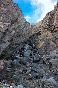 Истоки реки находятся на склонах горы Талтура. В верхнем течении река протекает через озеро Кольдуоюк и принимает в себя множество мелких ручьев и родников. Во время таянья снегов вода в реке мутно-бурого цвета, в остальное же время прозрачная. В среднем течении река протекает в каньоне и имеет цепь водопадов. В нижнем течении водоток активно разбирается на орошение пастбищ посредством сети искусственных арыков.