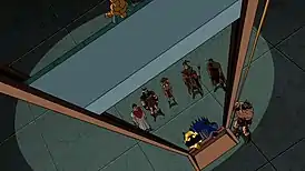 ![]() Пещерный человек хочет казнить Бэтмена и Золотого Бустера на гильотине | |||||