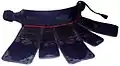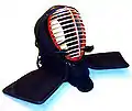 Защитная экипировка надевается для защиты определённых зон на голове, руках и теле. Голова защищается стилизованным шлемом, называемым (яп. 面 мэн), с металлической решёткой (яп. 面金 мэн-ганэ) для защиты лица, с серией жёстких кожаных и тканевых клапанов (яп. 突垂れ цуки-дарэ) для защиты горла и с подбитыми тканевыми щитками (яп. 面垂れ мэн-дарэ) для защиты шеи и плеч. Предплечья, запястья и кисти рук защищены длинными, толстыми тканевыми перчатками, называемыми (яп. 小手 котэ). Торс защищён нагрудником (яп. 胴 до), а область талии и паха защищена (яп. 垂れ тарэ), состоящей из пяти толстых вертикальных тканевых лоскутов или фалдов.