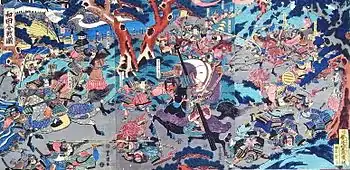 Сражаться начали в часу обезьяны, и уже стали видны звезды, а бой все не прекращался. Ясутоки руководил боем и сам был впереди самураев и простых воинов; к рассвету он отбил воинов Ёсимори и, заняв сам перекресток улиц, послал Асикага Ёсиудзи для нападения на отступающего врага. Однако вражьи силы увеличились и оправились духом; тогда Ёситоки и Хиромото послали за общими подписями призыв в области Мусаси и Сагами, чтобы оттуда явились на помощь. Между тем пал от шальной стрелы храбрый и сильный вражий военачальник Цутия Ёсикиё и войско противника пало духом; Ёсимори понёс поражение и погиб, а за ним пали и другие. После боя Ясутоки представил головы сраженных врагов и пленников…