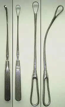 - кюретка гинекологическая — односторонняя кюретка в виде кольца, заточенная с одного края, применяется для выскабливания полости матки при искусственных абортах и некоторых заболеваниях и патологических состояниях эндометрия.