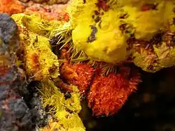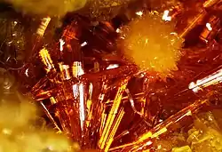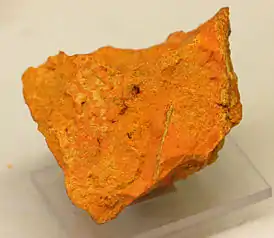В основном образует гранулированные, массивные, землистые минеральные агрегаты или твёрдые покрытия. Реже игольчатые кристаллы от жёлто-оранжевого до красно-оранжевого цвета.