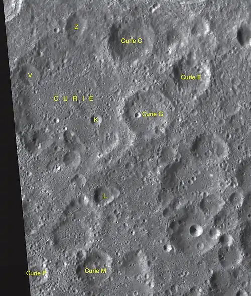 - Образование сателлитных кратеров Кюри C, E, G и M относится к нектарскому периоду[1].