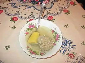Затем мякоть баранины, пропущенную с репчатым луком через мясорубку, соединяют с рисом, солью и специями. Разделяют шарики, закатывая в каждый несколько штук сушеной алычи. Затем их вместе с картофелем и мелко шинкованным луком вводят в бульон. Курдючное сало (мелко нарезанное), соль, перец и настой шафрана добавляют за 10-15 минут до конца приготовления. Всё посыпается зеленью и подаётся к столу.