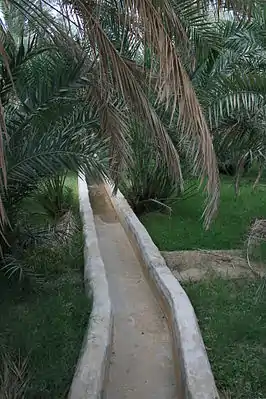 Если было невозможно подвести воду к цели под покровом земли, были построены поверхностные каналы. Это решение использовалось только в качестве крайней меры из-за загрязнения, интенсивного испарения и нагрева, неизбежного при наземном переносе воды. Часто под землей каналы были разделены на распределительные сети, состоящие из более мелких каналов (харис), которые снабжали каждый крупный город. Как и канаты, харисы также строятся под землей, чтобы предотвратить возможное загрязнение и заражение. Длина cтроительствa зависела в первую очередь от глубины тоннеля. На глубине двадцати метров бригада из четырех рабочих в течение дня смогла вырыть 40 метров тоннеля. Когда высота шахты доступа составляла 40 м, ежедневный прогресс уменьшался до 20 метров, а на глубине 60 м ежедневный прогресс уже падал до пятиметрового участка. Строительство многих длинных и глубоких каналов занимaло десятилетия.