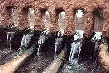 Кяриз, снабжающий водой городские или сельскохозяйственные районы, часто делится на несколько небольших каналов, проходящих к отдельным получателям (или на отдельные пахотные поля). Емкости с рядом одинаковых отверстий на одном уровне используются для равномерного распределения воды.