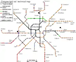В штадтбане Кёльна действует линейно-маршрутная система движения трамваев. Имеется 11 маршрутов.