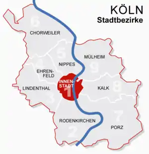 Кёльн разделён на 9 городских округов (нем. Stadtbezirk) и на 86 городских частей (районов) (Stadtteil):