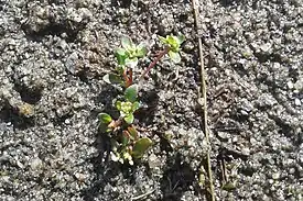 Листья эллиптические или округло-эллиптические, тупые, немного мясистые, самые верхние и нижние обычно супротивные, остальные — очерёдные. Пластинка 1,5—6 мм длиной и 0,1—0,5 мм шириной. Верхние листья на коротких черешках, нижние — на черешках по длине равных пластинке.