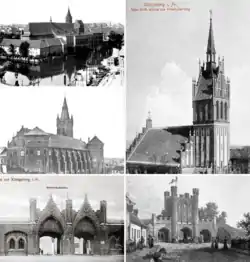 Ещё до конца Второй мировой войны, в августе 1944 года город Кёнигсберг был сильно разрушен британскими бомбардировщиками в ходе операции «Возмездие»[21]. Бомбардировкам подвергся в основном исторический центр города, где практически не было военных объектов. Погибло множество мирных жителей, полностью разрушен старый город, в том числе англичанами уничтожены кафедральный собор, оперный театр, городская библиотека, университет, дом, в котором родился Э.Т.А. Гофман, и многие другие гражданские объекты[22]. Сильно пострадал замок. Позднее город был взят штурмом советскими войсками.