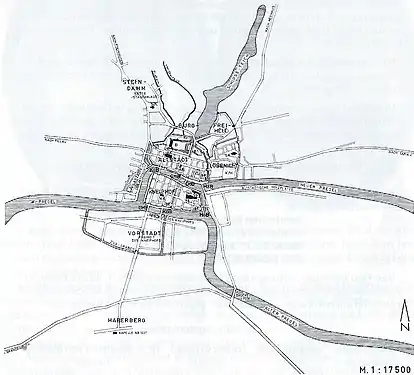 «Тройной» город (Альтштадт, Лёбенихт и Кнайпхоф), который фактически был единым, но состоял из трёх административно независимых частей (каждый из трёх городов имел свою ратушу, своего бургомистра, собственный суд и т. д.), просуществовал до 1724 года.