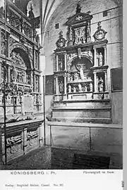 Богатое убранство собора было практически полностью уничтожено (сгорело) во время Второй мировой войны. Сохранились только некоторые каменные эпитафии. Наиболее примечательная из них — эпитафия — надгробный памятник герцога Альбрехта Гогенцоллерна работы фламандского архитектора и скульптора Корнелиса Флориса (архитектор Антверпенской ратуши). Эпитафия выполнена в стиле фламандского ренессанса (маньеризма). Размеры эпитафии — 11 метров в высоту и 12,5 в ширину. Первоначально эпитафия была богато украшена скульптурами, колоннами, гербами и т. п., но после войны от неё остался только голый каркас (восстанавливается с 2009 года[12]). Эпитафия расположена у торцевой восточной стены собора.