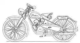 Рама мотоцикла трубчатая, закрытого типа с кареткой для педалей велосипедного типа. Передняя вилка паралелограмного типа, с двумя пружинными амортизаторами и фрикционными демпферами колебаний, заднее колесо без амортизации. Седло водителя велосипедного типа оснащалось двумя спиральными пружинами. На щитке заднего колеса установлен багажник и двa инструментальныx ящикa. На более поздних моделях устанавливался ящик цилиндрической формы над двигателем, под седлом.