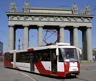 ![]() Трамвайный вагон ЛВС-2005 у Московских Триумфальных ворот. Санкт-Петербург | |
