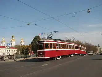 ![]() Трамвай ЛМ-33 с прицепным вагоном ЛП-33 на Старо-Никольском мосту в Санкт-Петербурге | |